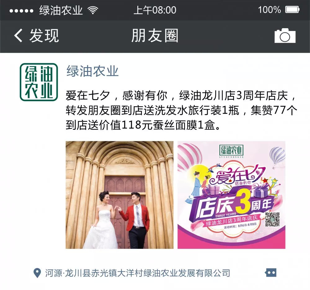 愛在七夕,感謝有你,綠油龍川店3周年店慶,轉(zhuǎn)發(fā)朋友圈到店送洗發(fā)水旅行裝1瓶,集贊77個到店送價值118元蠶絲面膜1盒。
