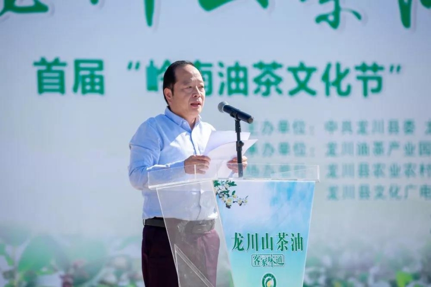 ▲縣委書記黃添勝宣布龍川首屆“嶺南油茶文化節(jié)”暨精準(zhǔn)扶貧成果展正式開幕。