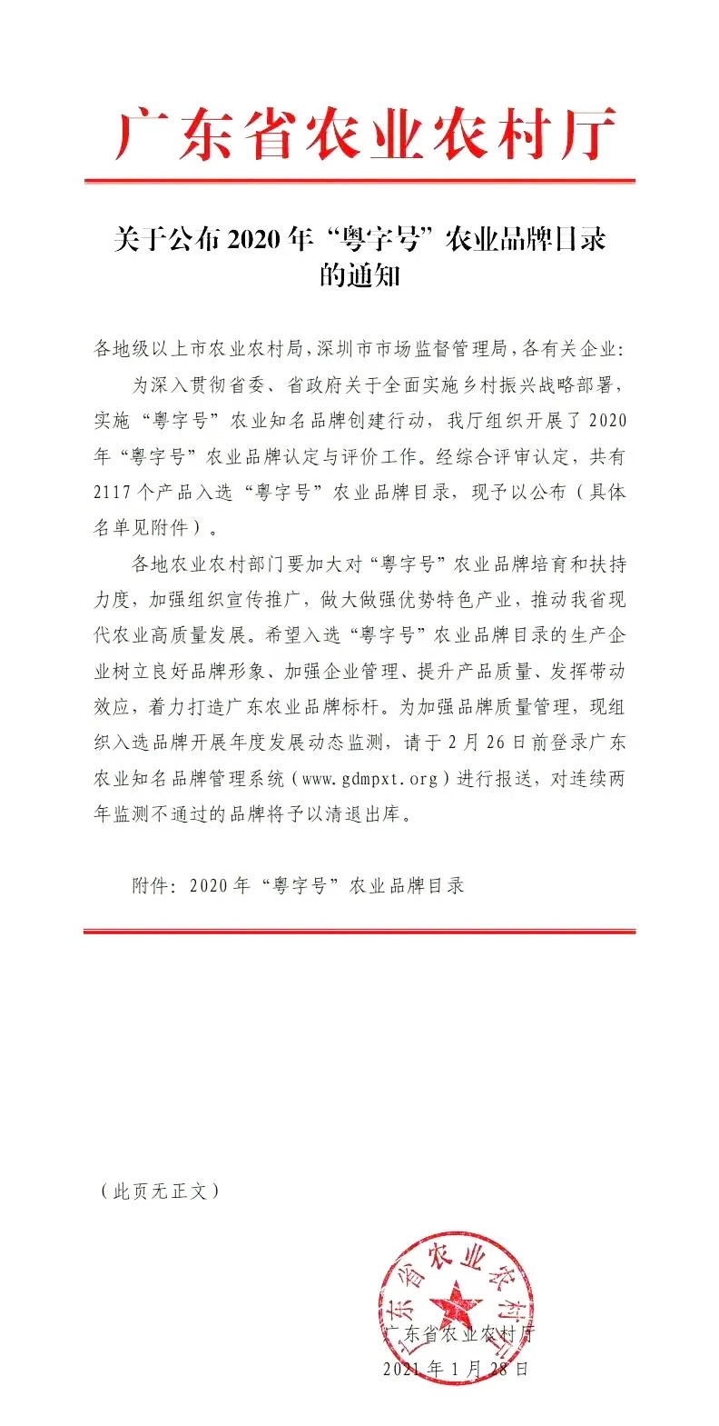 入選2020年“粵字號(hào)”農(nóng)業(yè)品牌目錄