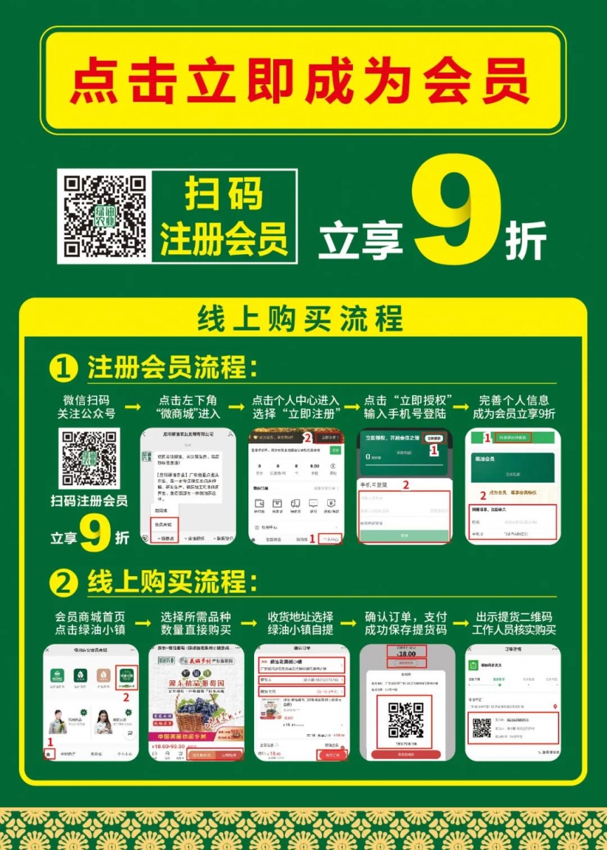 ②線上綠油微商城油茶節(jié)預(yù)定專區(qū)付款預(yù)定,新會(huì)員可先在微商城在線注冊(cè)成為綠油會(huì)員,即可預(yù)定買一送一,提貨可憑付款訂單選擇線下自提或快遞到家。