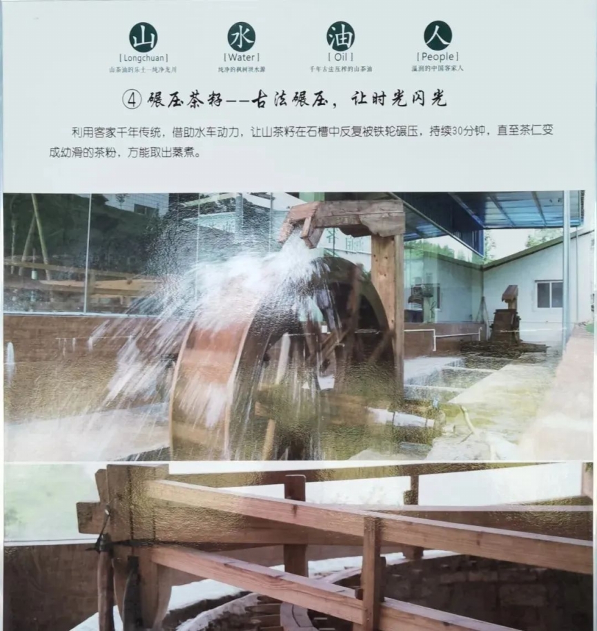 4.碾壓茶籽。利用客家千年傳統(tǒng),借助水車動(dòng)力,讓山茶籽在石槽中反復(fù)被鐵輪碾壓,持續(xù)30分鐘,直至茶仁變成幼滑的茶粉。