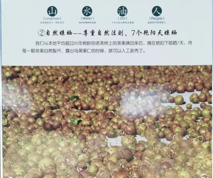 2.自然晾曬。在茶果采摘回來(lái)之后,需要攤在艷陽(yáng)天下晾曬7天,直到每一顆茶果自然裂開(kāi)、露出烏黑果仁。