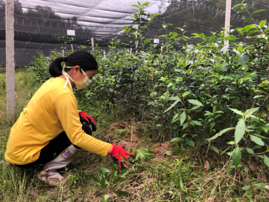 貧困戶楊滿風(fēng)在龍川綠油農(nóng)業(yè)種植養(yǎng)殖休閑養(yǎng)生田園綜合體負(fù)責(zé)除草等工作。(攝影:曾俊霖)