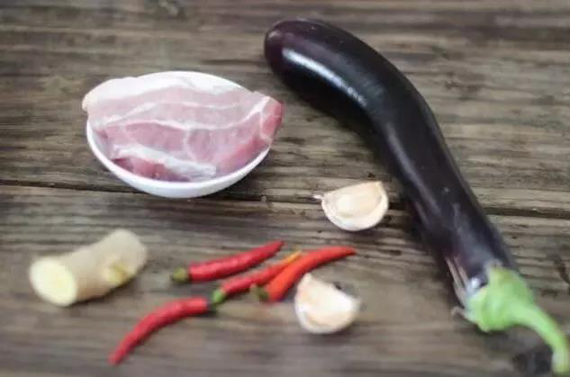 長(zhǎng)茄子 1根、豬肉 60克、生姜 一塊、大蒜 兩瓣、小米椒 4個(gè)、