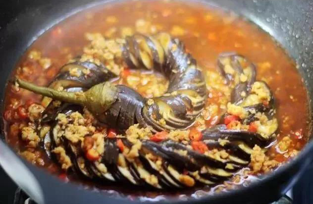 加入適量開水,放入蒸過的茄子,燒至湯汁濃稠。